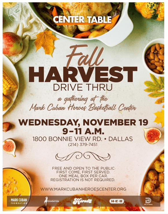 DALLAS (Nov. 14, 2025) – With food banks facing major shortages and one in six North Texans experiencing food insecurity, the sixth-annual Center Table Fall Harvest Thanksgiving food pantry event will be held Wednesday, Nov. 19, from 9-11 a.m. at the Mark Cuban Heroes Basketball Center (1800 Bonnie View Rd, Dallas, TX 75216).