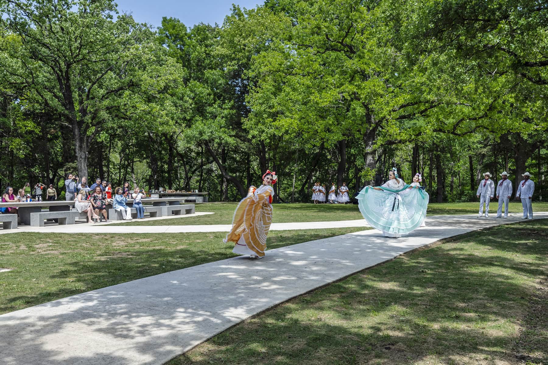 Goldberg created a mini stage at Crawford Park, along with an 80-foot-long, elliptical, community table and a smaller 30-foot table, all fabricated in Minnesota by Coldspring, USA. The tables are made of Golden Brazil granite and set on large, ovoid-shaped pedestals of Black Mesabi granite. The community tables are surrounded by solid Kenoran Sage benches. Crawford Memorial Park is located at 8700 Elam Road in Dallas.