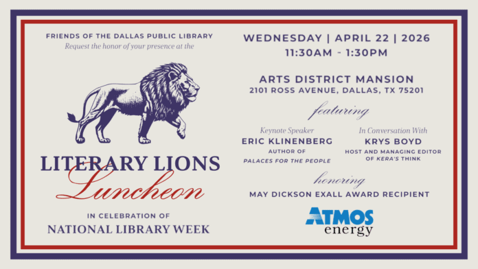 The luncheon will take place at the Arts District Mansion at 2101 Ross Avenue in Dallas from 11:30 a.m. to 1:30 p.m., featuring a keynote address from award-winning sociologist and author Eric Klinenberg. He will be joined in conversation by Krys Boyd, host and managing editor of KERA’s Think. Sponsorships and tickets are available at bit.ly/literarylions. For more information on underwriting and donations, please contact Friends of the Dallas Public Library at [email protected].