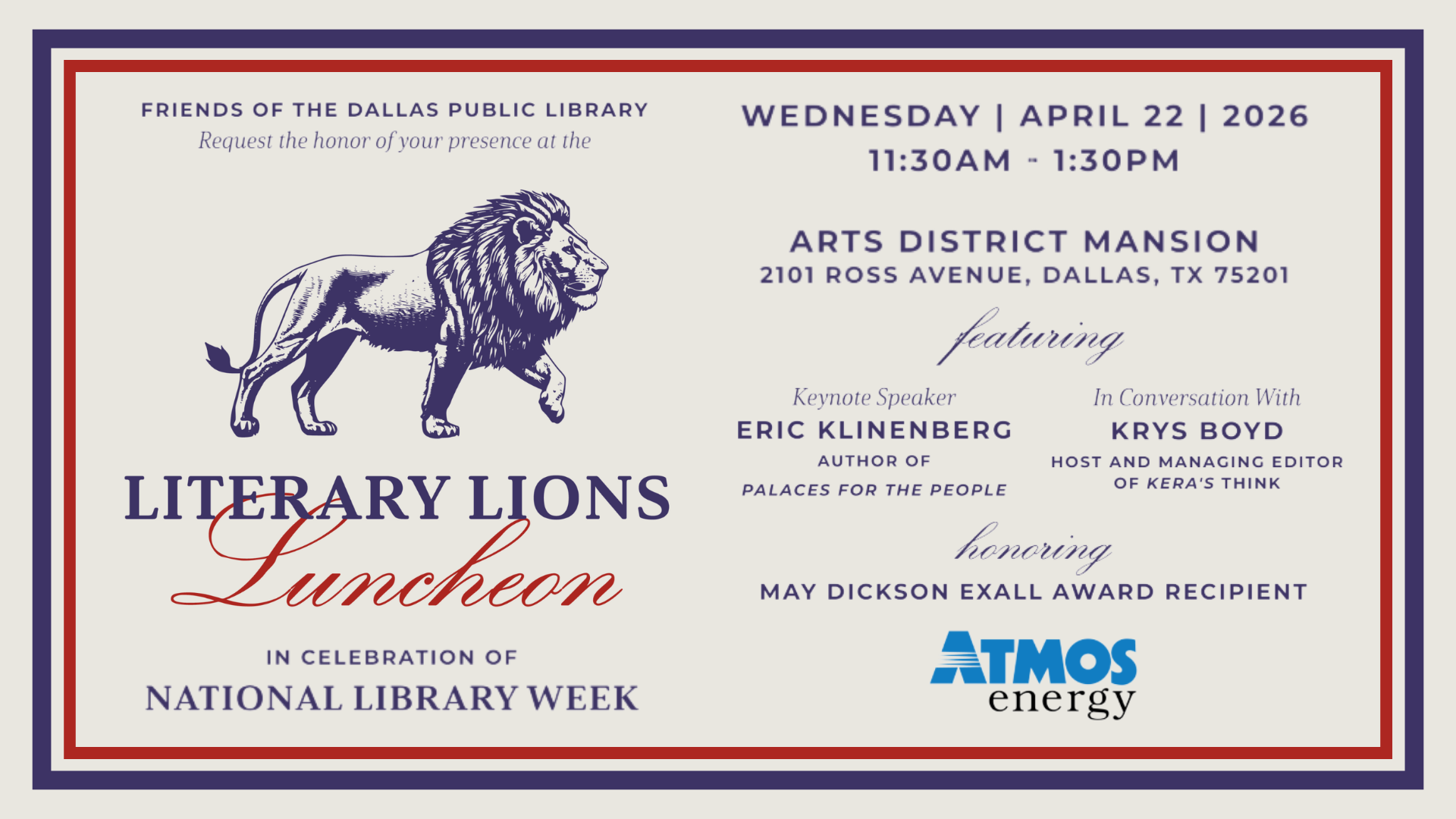 “Libraries are community lifelines. They bring people together, bridge divides, and are just as essential to a strong, resilient community as physical infrastructure,” said Klinenberg. “I am thrilled to join the Friends of the Dallas Public Library for the Literary Lions Luncheon and celebrate the incredible work these institutions do every day.”