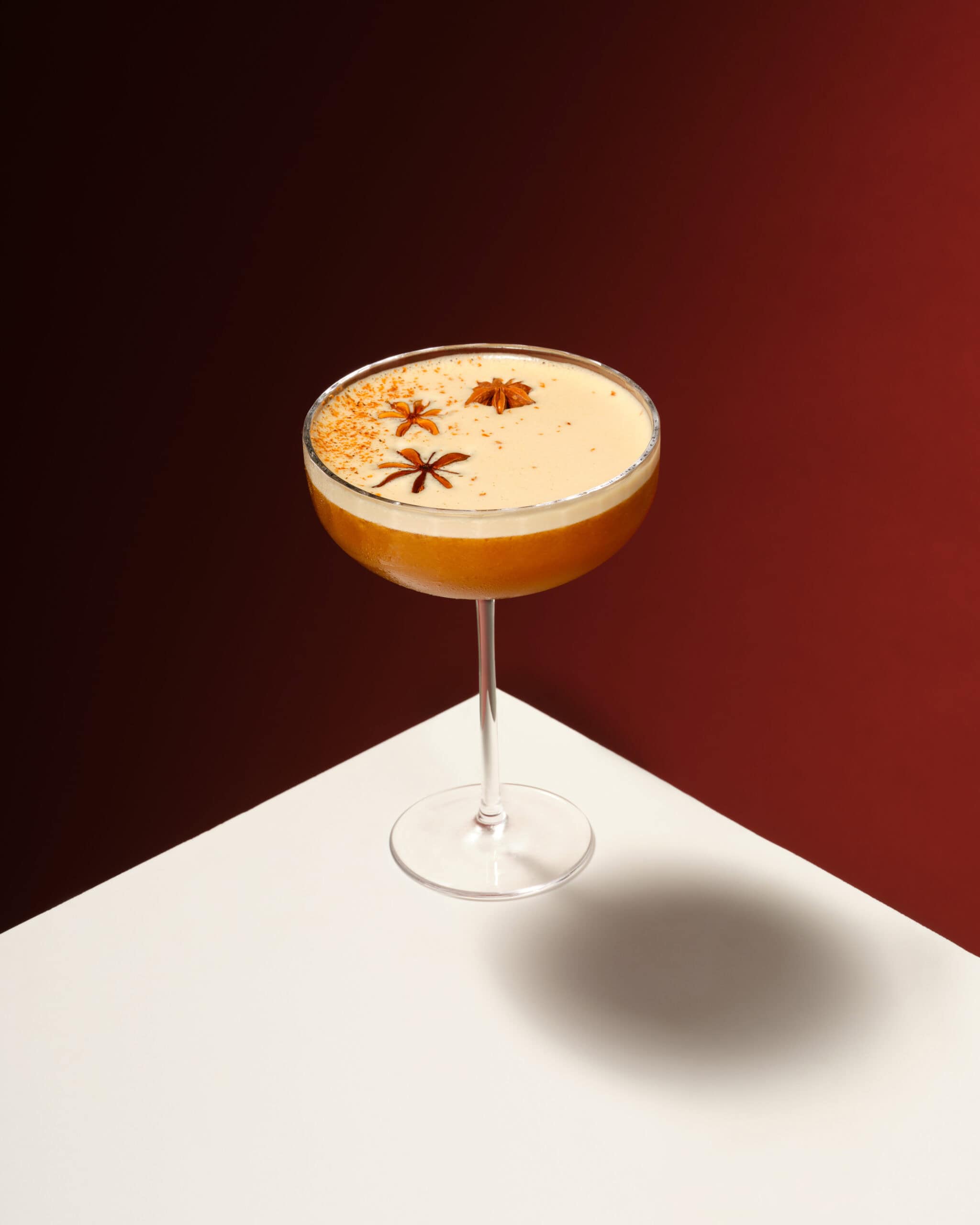 Build in a glass for the cascading effect by adding the cream last over the cocktail with ice. Or give it a big shake and pour it over ice. Garnish with grated nutmeg or cinnamon for nice aroma.