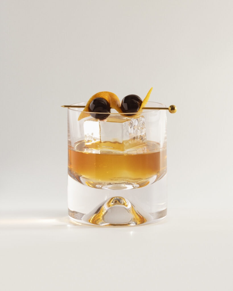 Instructions: In a mixing glass, add all ingredients. Stir for dilution and strain into a rocks glass over a large cube. Garnish with an orange twist & brandied cherry.